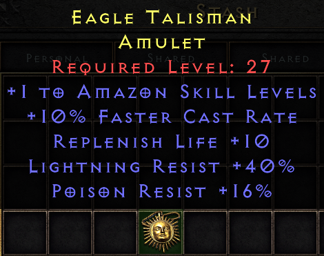 Req Lvl 27 | +1 Amazon Skills | 10% FCR | Replenish Life +10 | 40% Light Res | 16% Poison Res