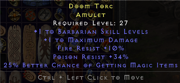 Im no professional but that amulet isnt worth much cuz its only +1 i think it needs to have +2 barb skill max damage ar life and resistance for it be worth something cuz u can just use highlords and stuff