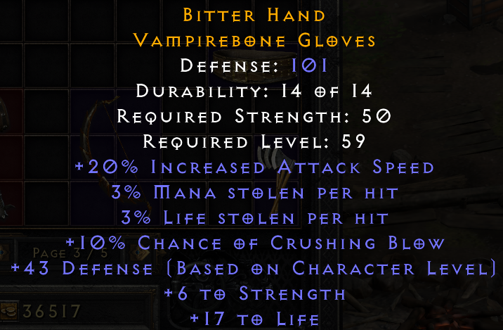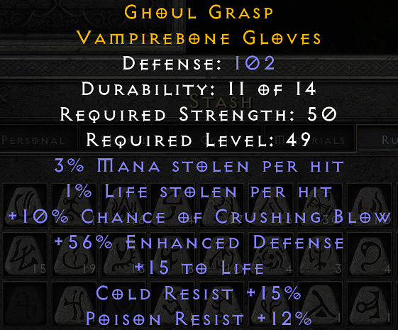 perfect AS, perfect dual leech for gloves (low but still good), perfect CB, good life roll. STR is a bit low even if always useful. Defense is bad.