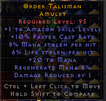 Ok thank you, I forgot to mention that required lvl is 95Necrarch wrote: 3 years agoDouble leech is nice, but others are low values : +1 skills instead of +2, fcr is not that useful on zons, others are just the default mods so one mod is missing.