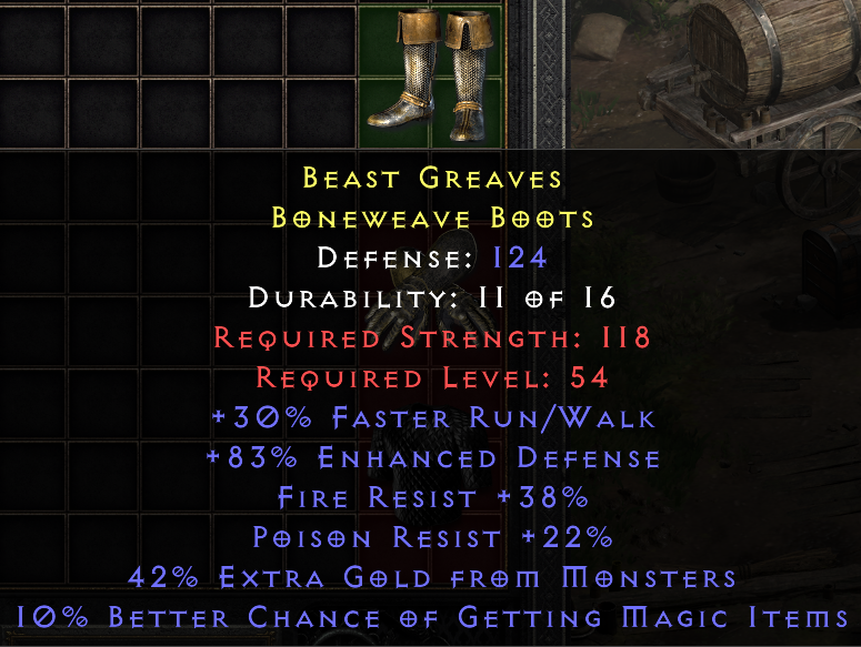 +30% FRW | +83% ED | +38% Fire Res | +22% Poison Res | 42% GF | 10% MF