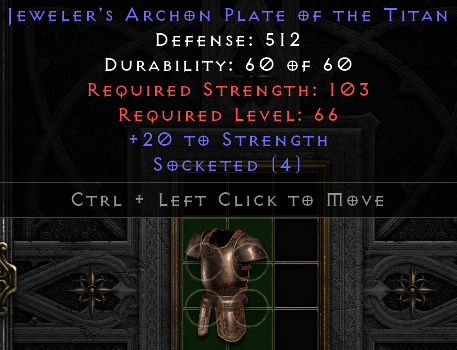 According to maxrolls guide for magic items it should have at least some value but in the price history I could only find one jeweler's armor with strength and that trade was from 2022 and it was a Gothic Plate: pricecheck.php?item=jeweler%27s&other=1 ... xsockets=4