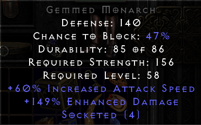Value: Hard to say. Ruby jewel of fervor with ~37ed are around 2~3 Jah a pop. The base Monarch was not even sup and only 140 def, so ~ Pul.