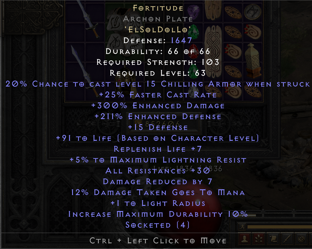Made in a Superior (+11% ED) Archon Plate base, perfect +30 all res roll. Curious what this would fetch.