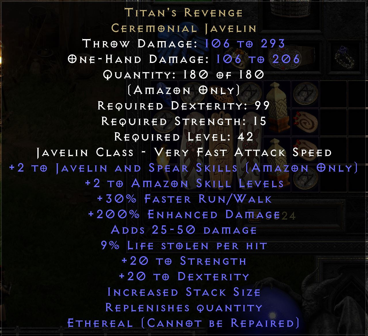 Trying to price a perfect ethereal Titan's Revenge (screenshot). Couldn't seem to find an identical one in the diablo2.io price history, but I found a 199% ED that went for a few Jah and Ber. I assume there's a premium on the perfect aspect of this item. Thoughts?