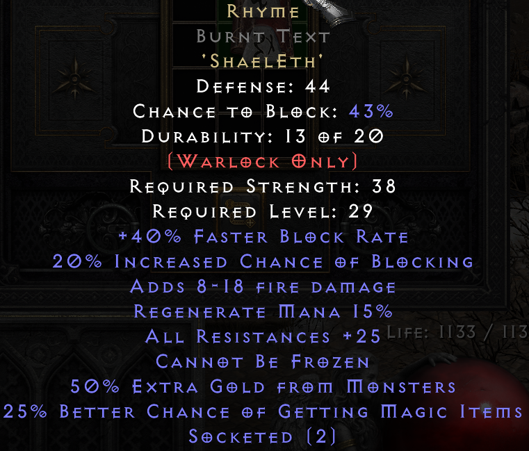 This really is a shield any non-dual wield, wild cowboy Frenzy Barbarian transitions into until you get your Ancient's Pledge or Spirit Monarch or whatever you're gonna use through Hell difficulty, you could even transition into Splendor if you are struggling with a Monarch base or Runes. Moreover, easy to throw this on a swap for Duriel, or anything in Act 5 really with the "Cannot Be Frozen". Realistically the baby brother to Spirit for a Sorceress with the +FCR and +Skills, +Mana Regen and, well really the +everything it has. If you're a new player, or just starting a new Class, nice to have a spare in your stash to move things along early game. Solid shield for Normal and even Nightmare difficulty.